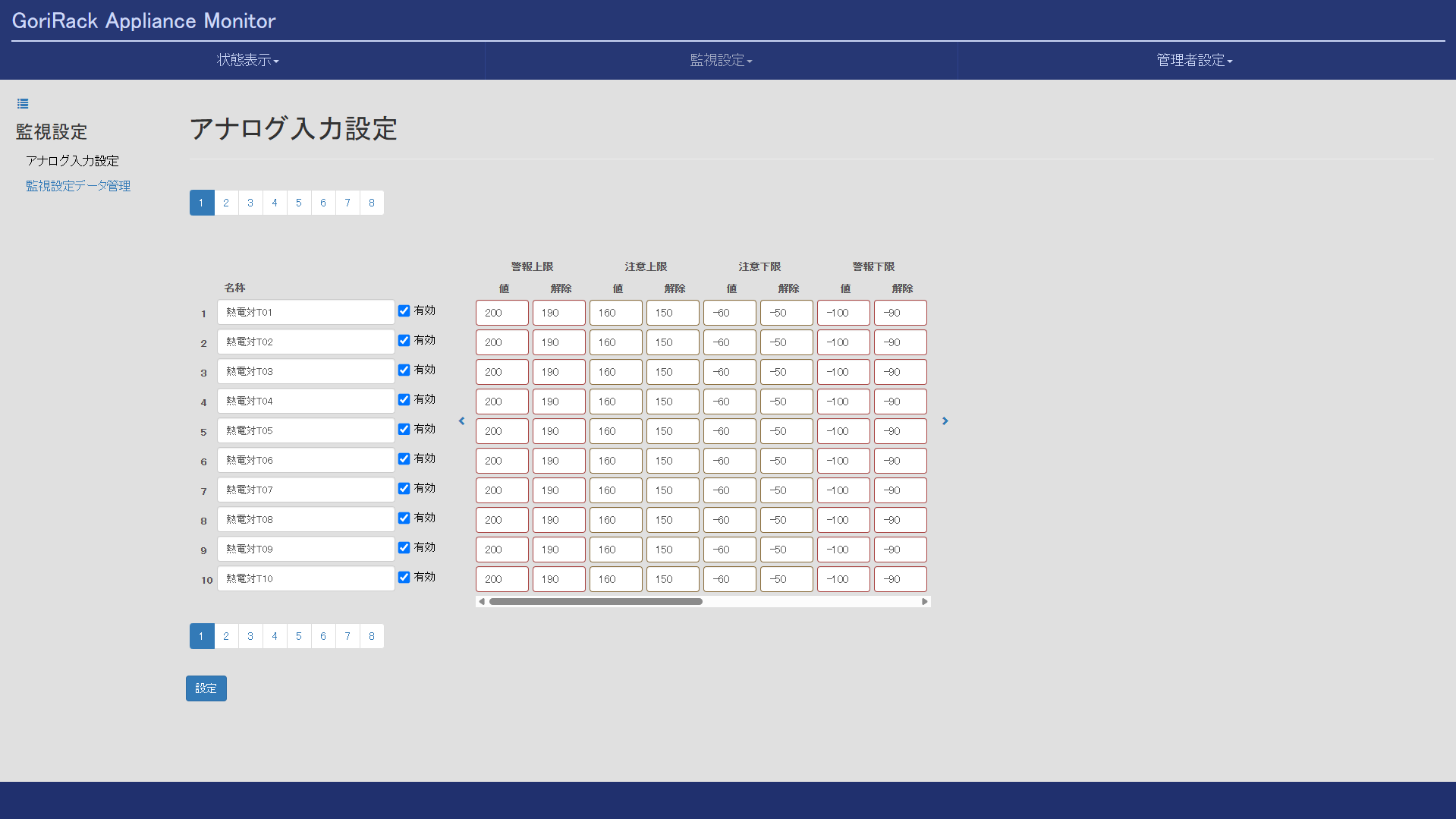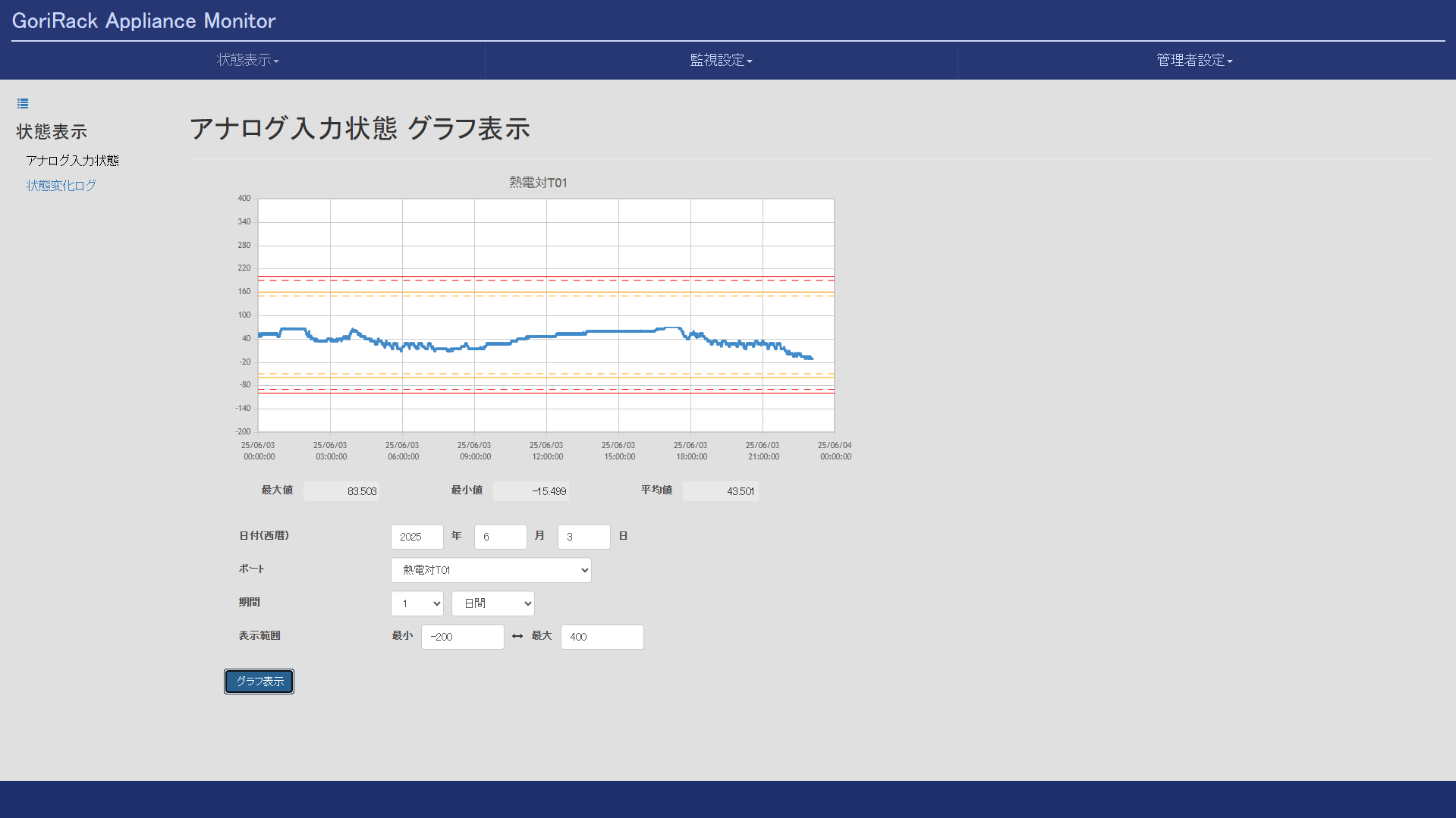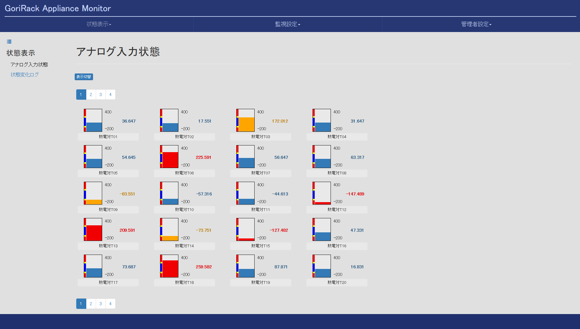 計装信号として使われている4~20mAや1~5Vの直流信号や様々なセンサ・検出器・メータ等から出力されるアナログ信号の閾値設定を行い、WebUIやSNMPマネージャから監視することができる多点アナログ信号監視専用ユニットです。1Uサイズで最大80点のアナログ信号を監視できます。