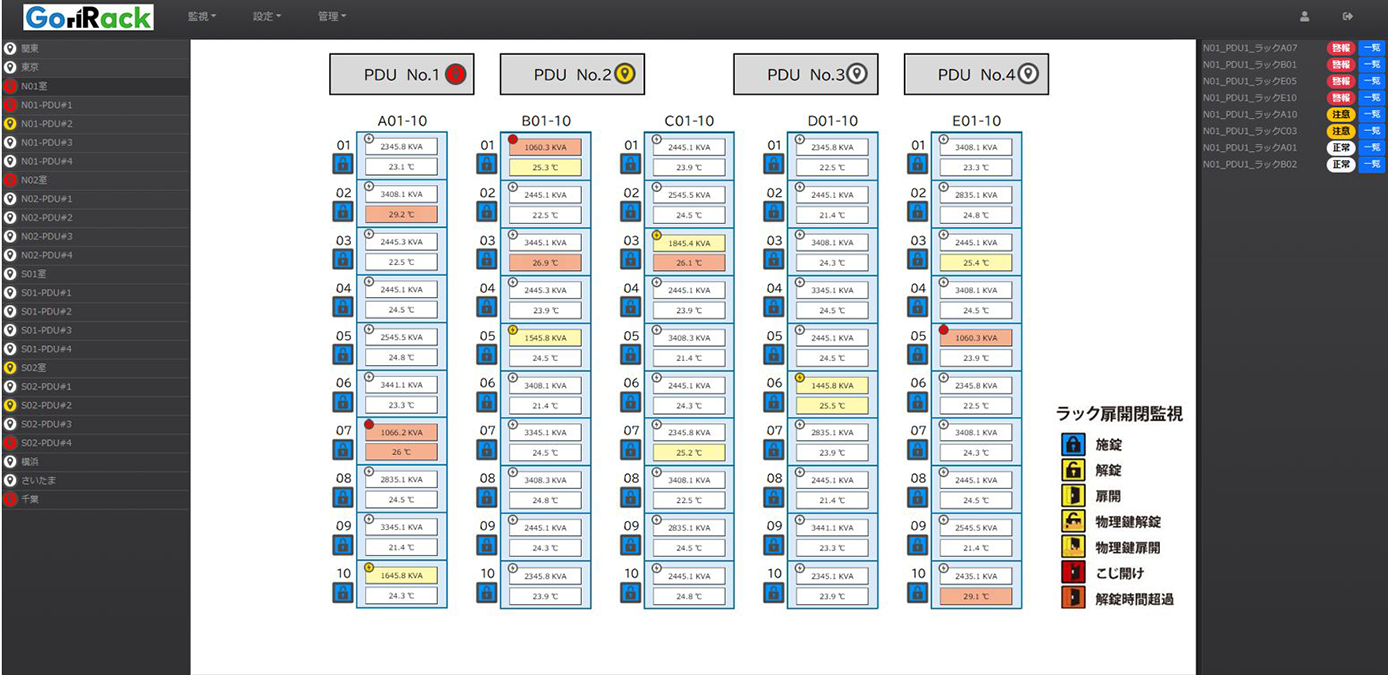 フロアマップ上で扉開閉状態、電子錠による解施錠状態、物理鍵による解施錠状態のアイコン表示で、リアルタイムのラック状態が一目で判ります。