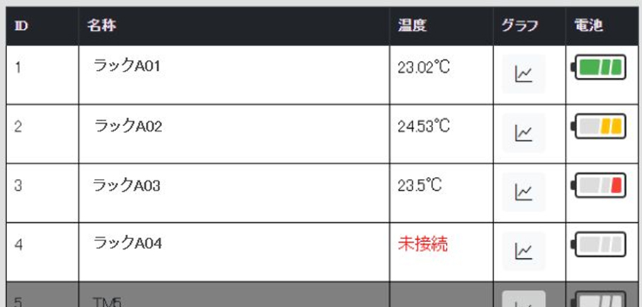 GoriMesh温度センサの電池電圧は電池アイコンで3段階(正常:緑,注意:黄,警報:赤)で表示されます。
