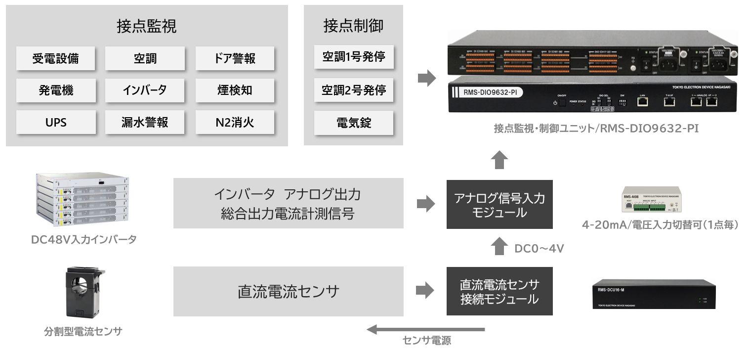 接点監視・制御ユニット「RMS-DIO9632」にアナログ入力モジュール「RMS-AI08」、また交流・直流電流センサ接続モジュールを接続して、各電流センサから電流値を取得します。