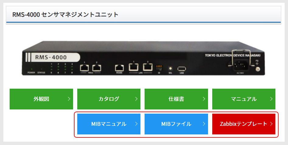 RMS製品のMIBファイル・マニュアル、及びZabbixテンプレートファイルは各製品ページのダウンロードボタンから取得できます。例)https://www.ngs.teldevice.co.jp/seihin/rms4000/